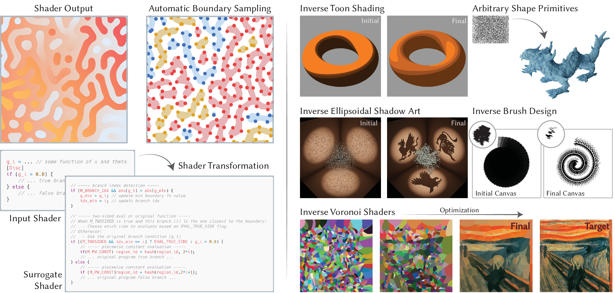 We introduce automatic boundary sampling for discontinuities in differentiable shaders. Given a shader that renders a piecewise-continuous output, we first transform it into a surrogate, piecewise-constant shader (shown on the left). This transformation enables our method to sample jump discontinuities by evaluating the shader along randomly selected line segments. We call this approach segment snapping; it removes the need for specialized boundary-sampling routines, which are tedious to implement and often ill-defined. Our method unlocks a variety of new applications (shown on the right).